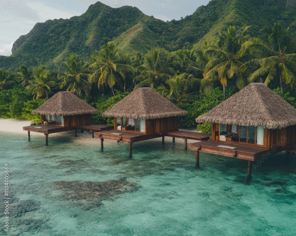 Tranquil Tropical Escape Serene Overwater Bungalows Amid Lush Wallpaper Mural - Decorly Solutions | Decorly Solutions