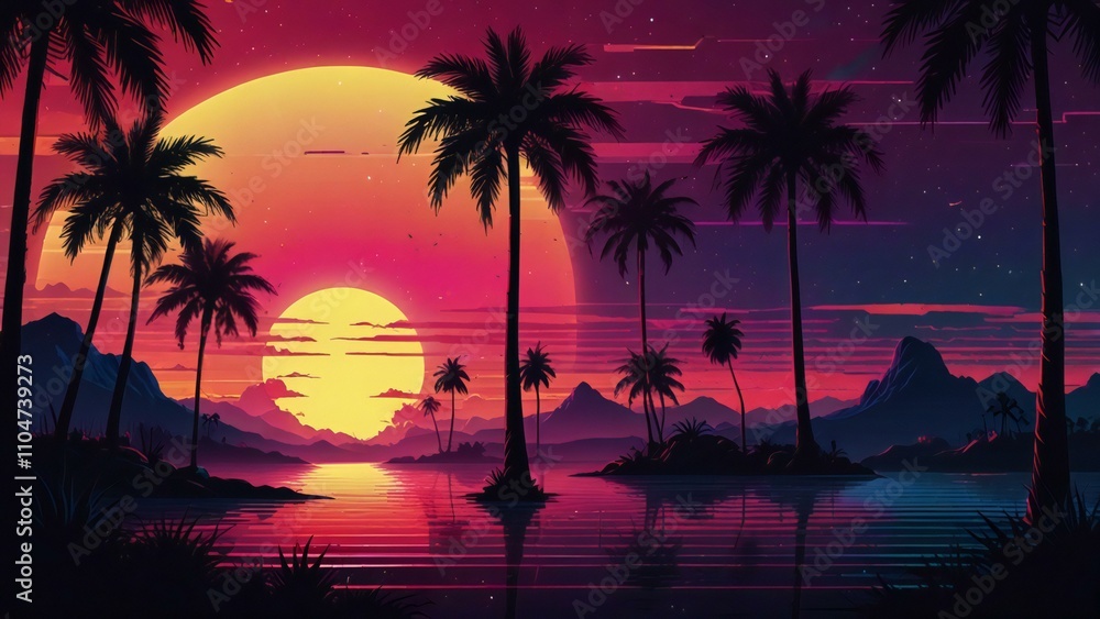 A stunning retro-futuristic scene featuring a vibrant pink and orange sunset over a calm tropical lake, with palm silhouettes and a glowing grid pattern reflecting on the water.