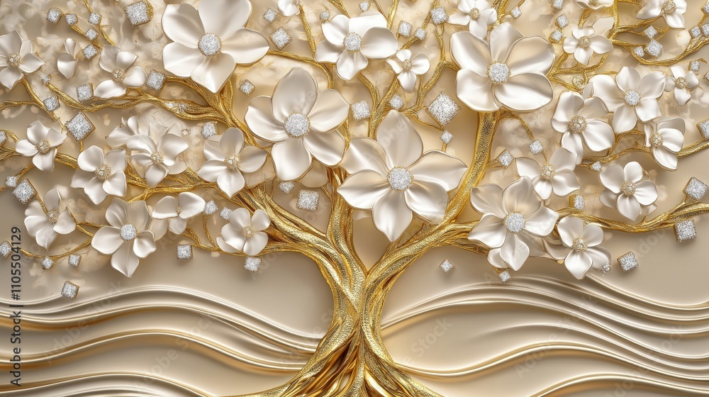 Luxury Golden Tree With White Flowers Diamonds Ornate Wallpaper Mural - Decorly Solutions | Decorly Solutions