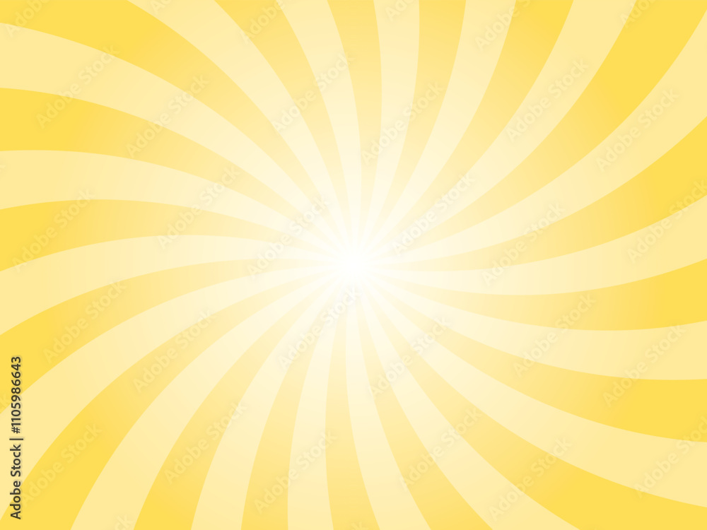 Abstract yellow background with rays retro starburst. Radial spiral stripes backdrop. Vintage sun beam texture. Sun rays pattern. Groovy retro swirl burst. Summer carnival background