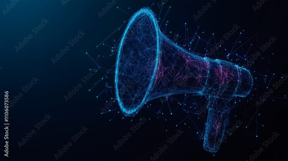 Abstract Blue Glowing Polygonal Mesh Megaphone On Blue Bokeh Background, 3d Rendering