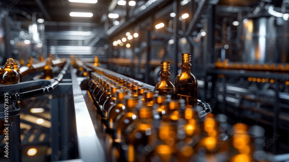 Factory conveyor belt carrying amber bottles in an industrial setting, showcasing the efficiency of automated production lines.
