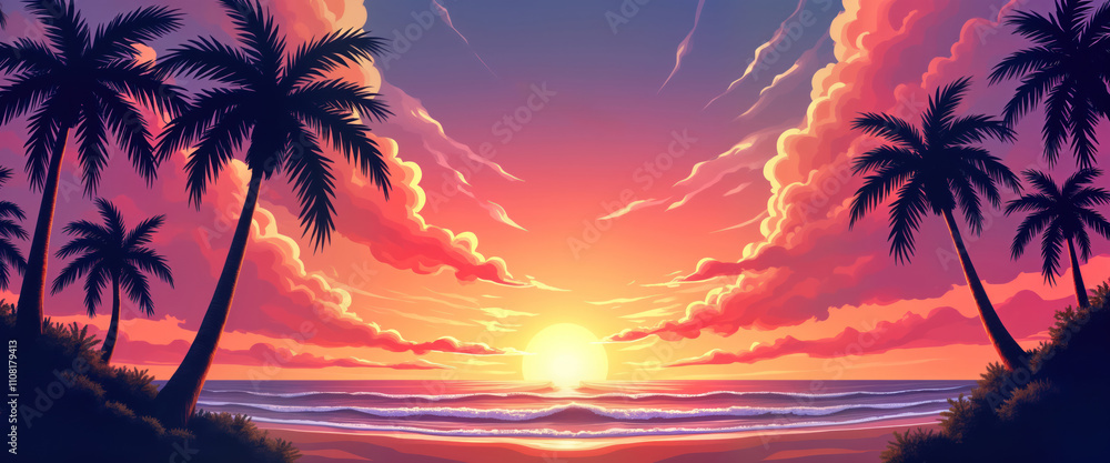 Vibrant Sunset Over Tropical Beach Silhouette Palm Trees Wallpaper Mural - Decorly Solutions | Decorly Solutions