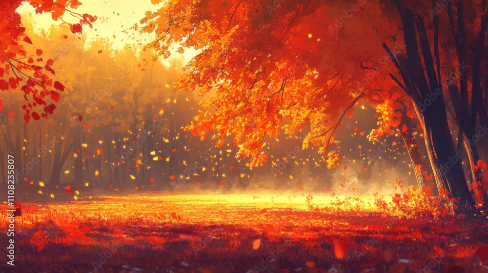 Autumnal Forest With Falling Leaves At Sunset Wallpaper Mural - Decorly Solutions | Decorly Solutions