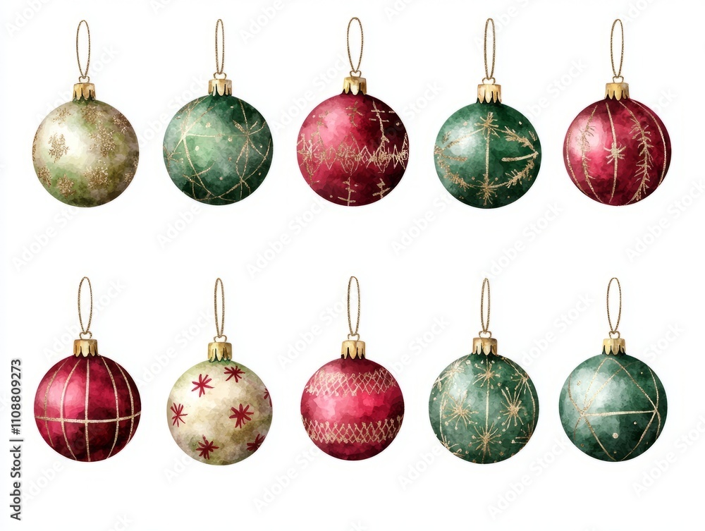 Festive Watercolor Christmas Ornaments In Red Green And Wallpaper Mural - Decorly Solutions | Decorly Solutions