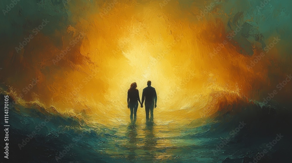 Couple Holding Hands Walking Towards Vibrant Horizon In Wallpaper Mural - Decorly Solutions | Decorly Solutions