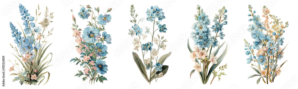 Elegant Watercolor Eucalyptus Arrangements in Muted Green and Blue Tones with White Florals for Wedding and Nature-Inspired Decor