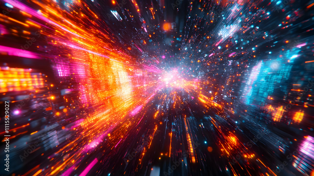 Data flow tunnel of bright orange and blue digital lights