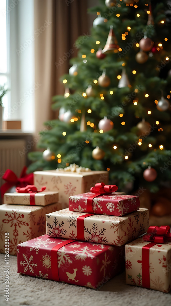 Array of wrapped gifts beneath a beautifully decorated Christmas tree, colorful ornaments, christmas tree