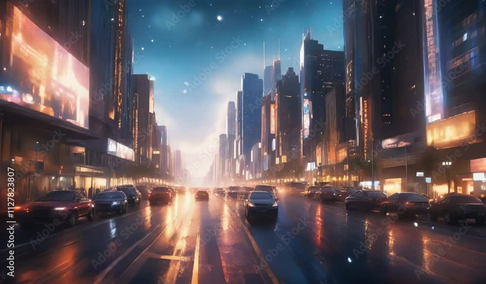 Vibrant city streets with neon signs, bustling traffic, and sleek skyscrapers capturing the essence of urban living in a modern metropolis at nightfall.