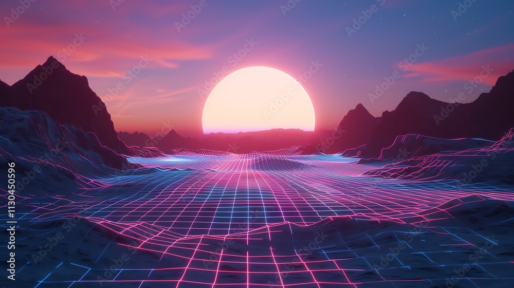 Retro Futuristic Sunset with Neon Grid and Mountain Silhouettes