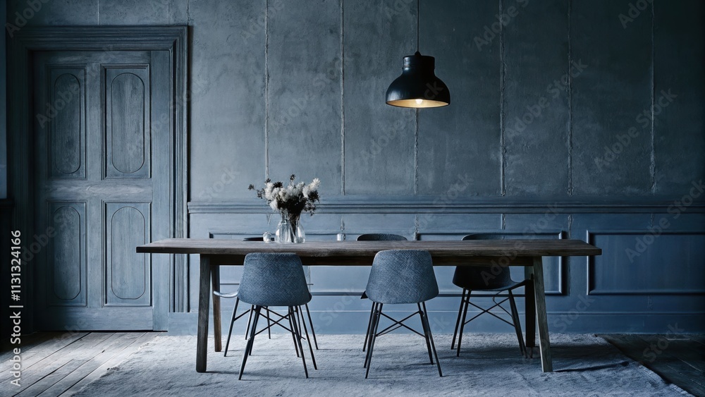 A Minimalist interior design of a modern Dining table and chairs in a clear loft with wooden beams in the dining room, a room with morning sunlight streaming through the window.