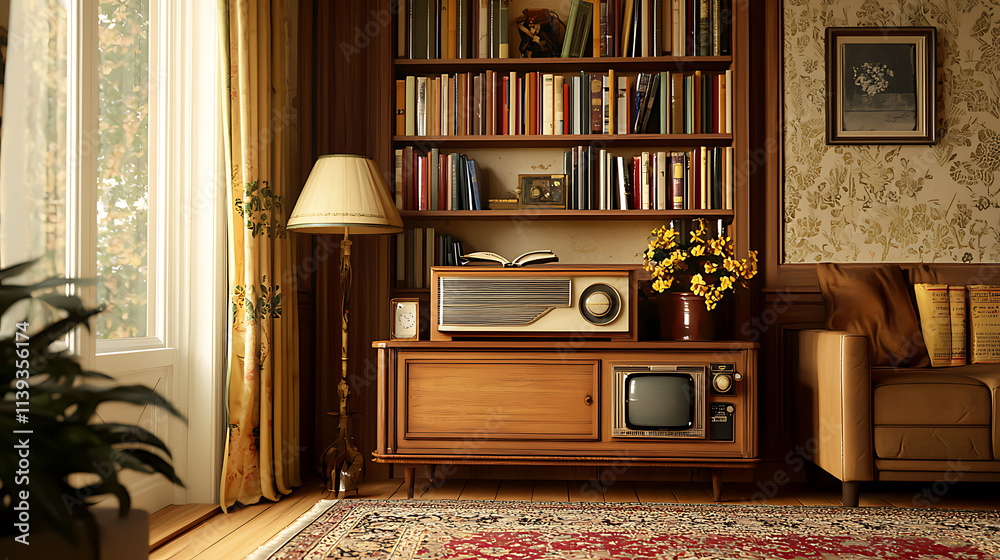 A Living Room With A Wooden Entertainment Center Wallpaper Mural - Decorly Solutions | Decorly Solutions