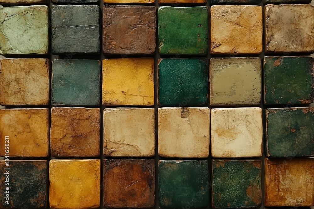 A vibrant arrangement of textured tiles in earthy greens and Wallpaper