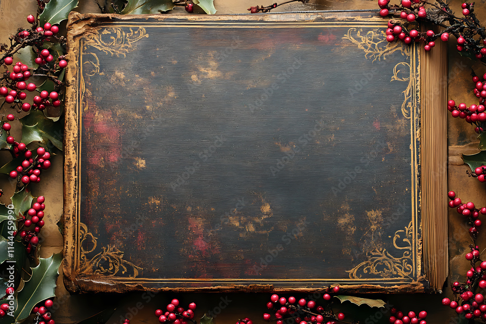 Ornate vintage frame adorned with festive holly berries and ornaments against a dark background.