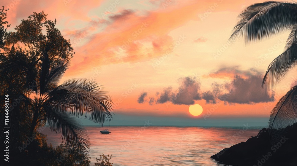 Vivid Tropical Sunset With Vibrant Gradients Of Coral, Tangerine, And Plum Hues. Framed By Lush Tropical Foliage, Evoking A Serene And Exotic Evening Atmosphere In Paradise.