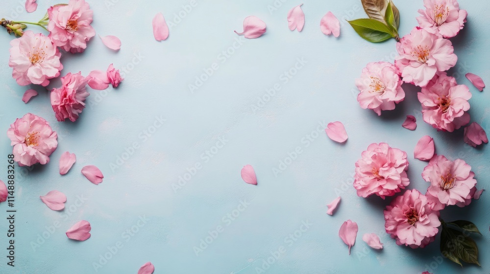 Elegant sky-themed mother’s day card design featuring delicate pink flowers on a light blue and mint background with bright confetti and empty area, perfect for summer gatherings or special occasions