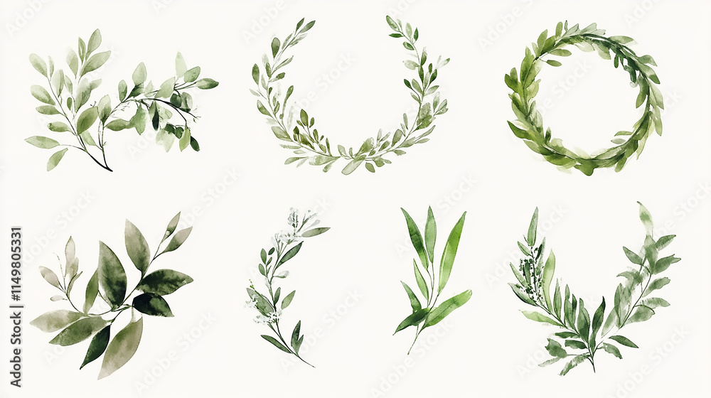 Set of watercolour floral compositions with green herbs and branches. Hand drawn illustrations bouquets of roses and eucalyptus branches