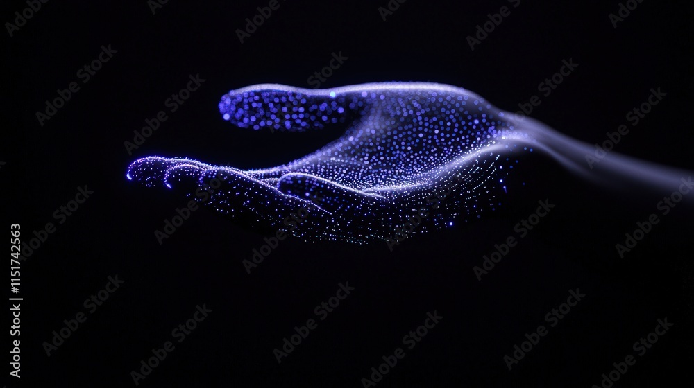A futuristic hand illuminated by vibrant neon colors, showcasing digital particles and a captivating glow.