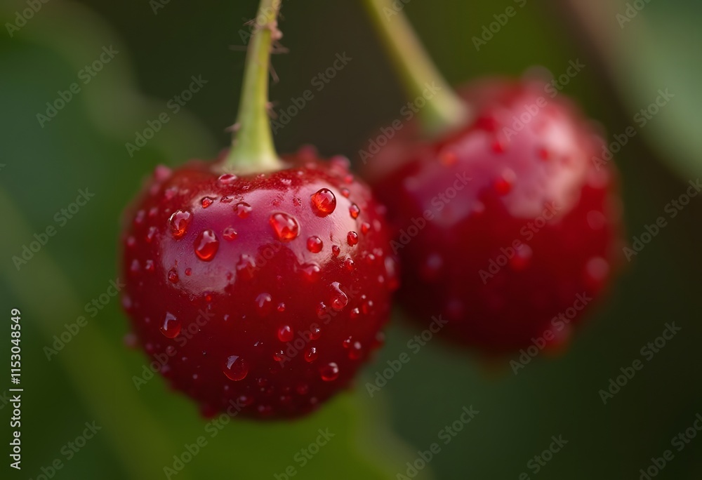 Fresh red cherries with water droplets glistening on their surface showcase natures beauty and delicious treat