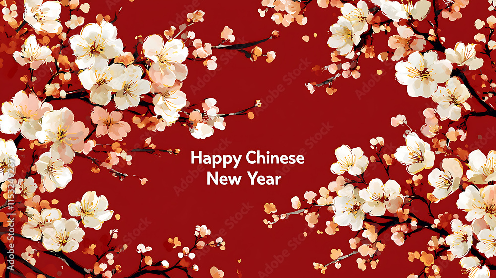 Happy Chinese New Year Greeting With White Flowers Wallpaper Mural - Decorly Solutions | Decorly Solutions