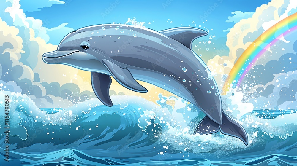 Playful Dolphin Leaping Ocean Waves Rainbow Bubbles Sky