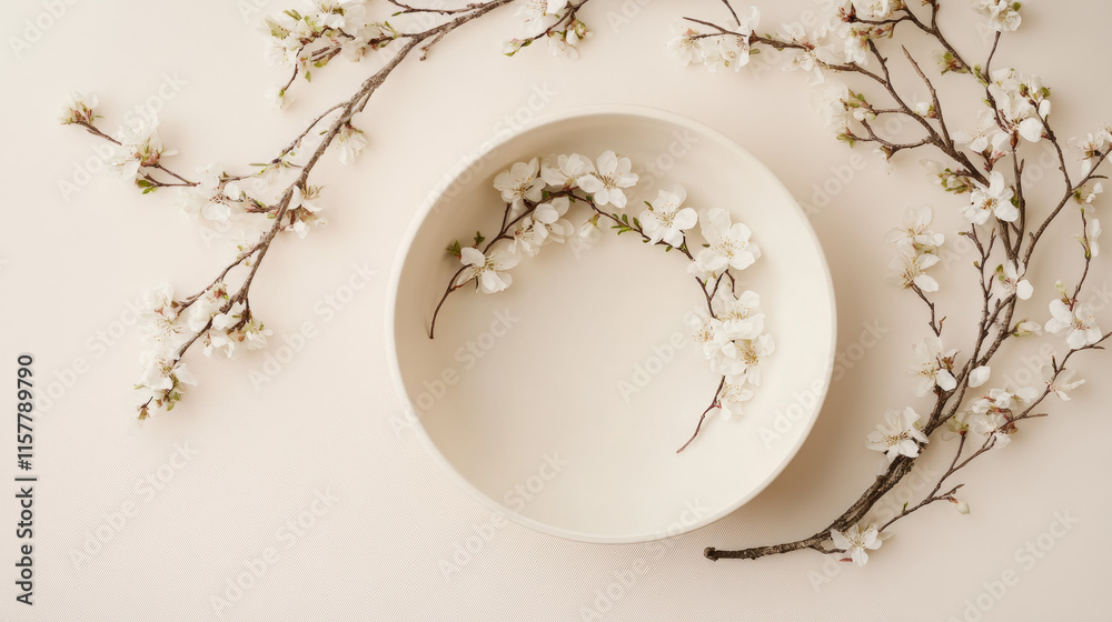"newborn Neutral Spring Background – Round White Bowl With Floral Wreath And Branches On A Light Beige Backdrop."
