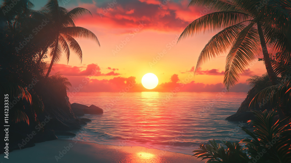 Vibrant And Peaceful Tropical Beach At Sunrise With Wallpaper Mural - Decorly Solutions | Decorly Solutions