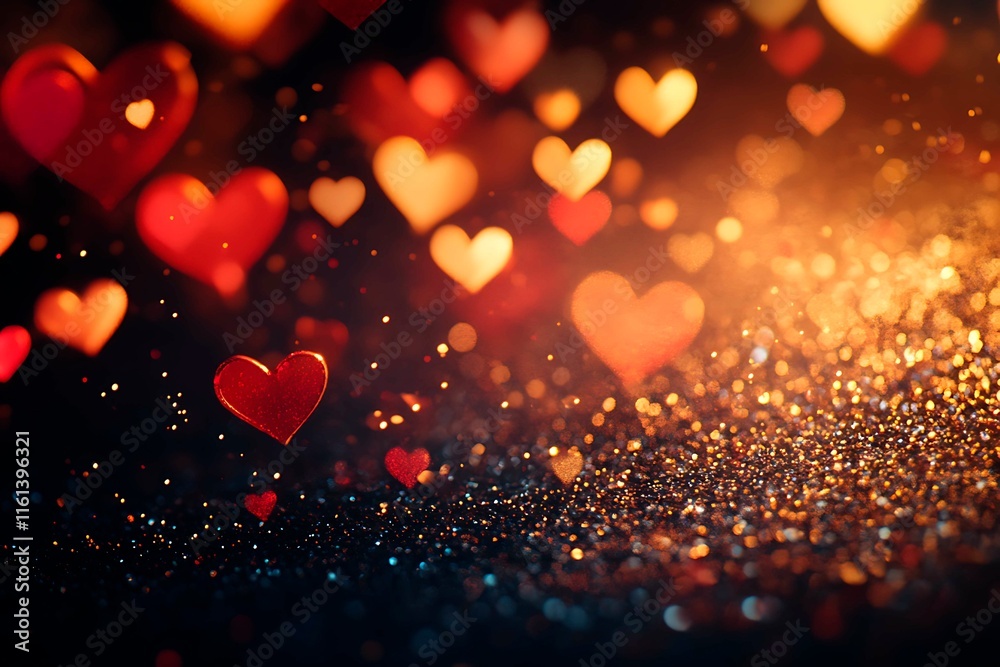 Romantic Valentine’s Day Background with Glittering Red Hearts and Warm Golden Glow, Perfect for Festive and Love-Themed Projects
