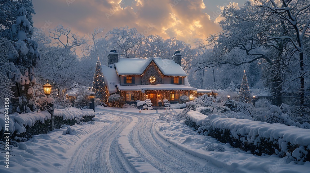 A Snow-covered House With Twinkling Christmas Lights And Wallpaper Mural - Decorly Solutions | Decorly Solutions