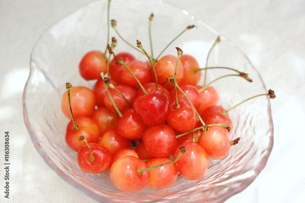 ガラスボウルに盛り付けたさくらんぼ