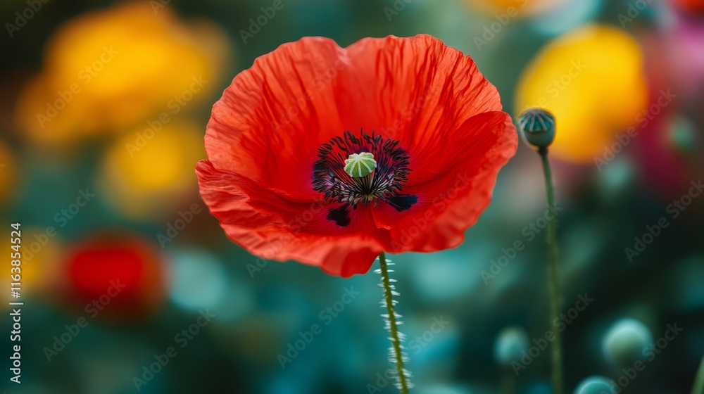 Vibrant Red Poppy Flower Amidst Colorful Blossoms In Wallpaper Mural - Decorly Solutions | Decorly Solutions