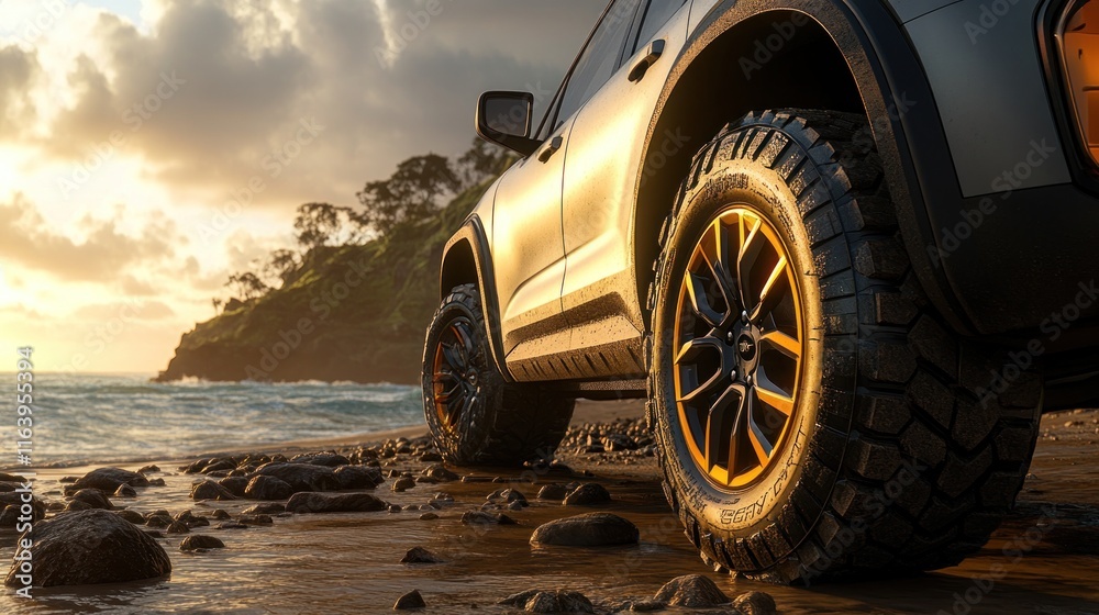 SUV on beach at sunset rocky shore tire close-up Wallpaper