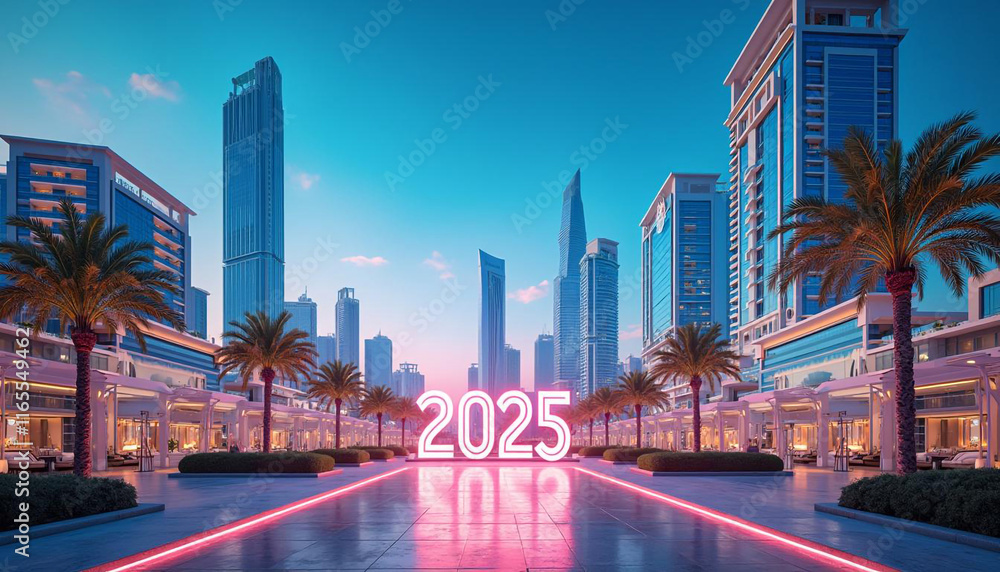 Vibrant Cityscape With 2025 Neon Sign Wallpaper Mural - Decorly Solutions | Decorly Solutions