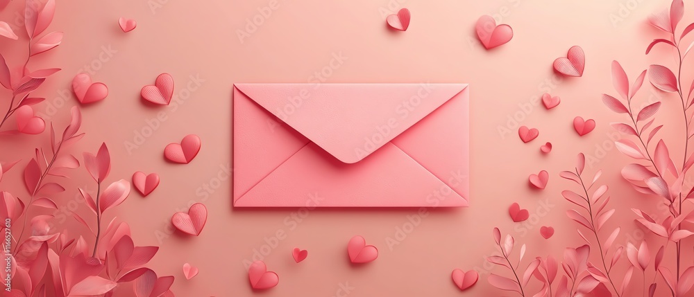Pink envelope surrounded by pastel hearts on a pink background. Perfect for Valentine's Day, love letters, and romantic themes.