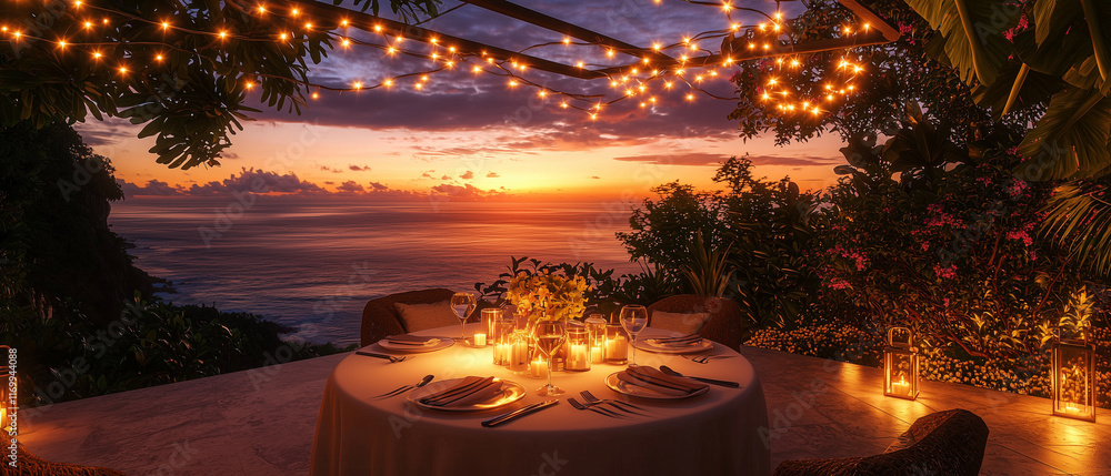 A Picturesque Dining Arrangement On A Terrace Featuring Wallpaper Mural - Decorly Solutions | Decorly Solutions