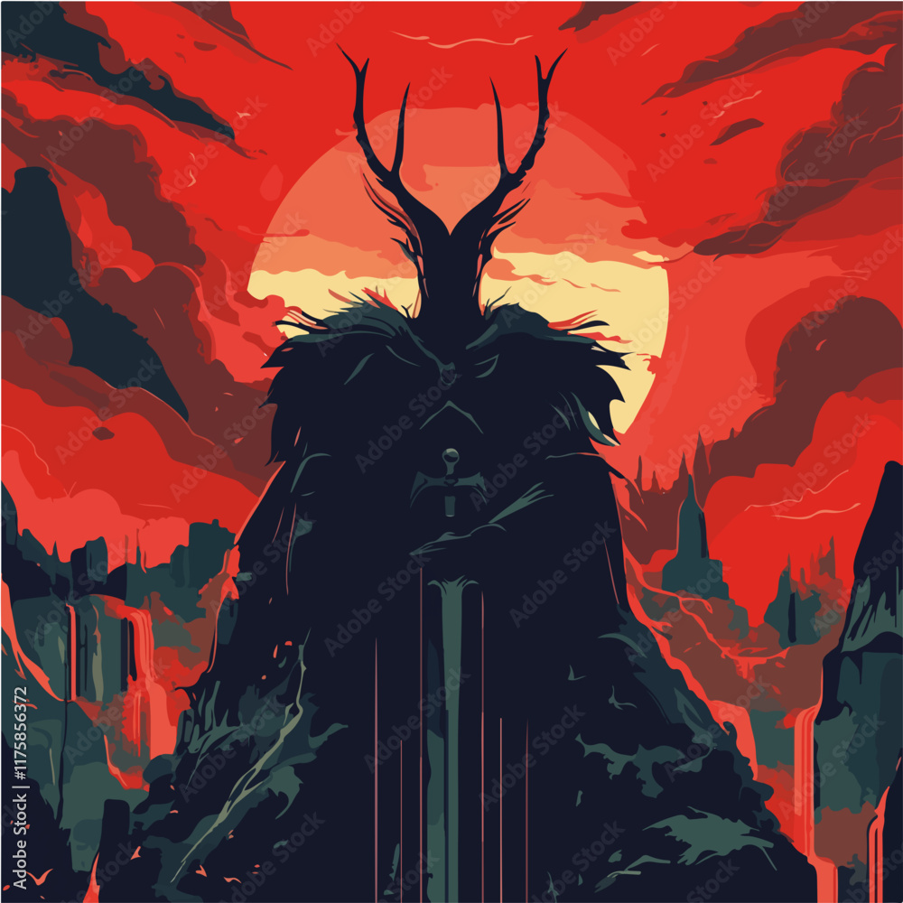 A Silhouette Of A Knight Fighting A Demon Vector Style Art Illustration Poster In Red And Black Colors Generative Ai