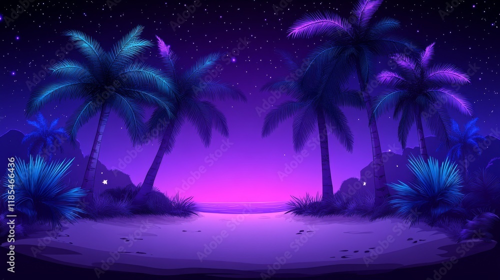 A neon-lit tropical scene with palm trees, a glowing sun and a starry sky.