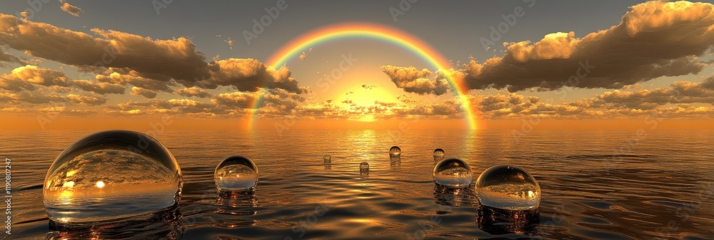 Sunset Over Ocean with Rainbow and Reflective Spheres - Idea Wallpaper