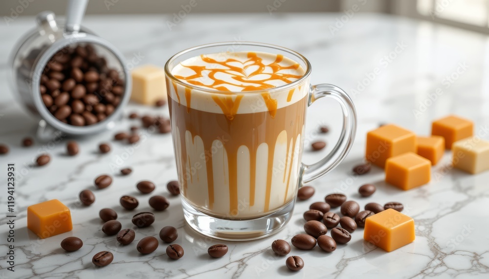 Caramel Latte Coffee Drink In Glass Mug With Wallpaper Mural - Decorly Solutions | Decorly Solutions