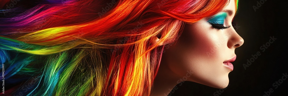 Vibrant, Colorful, Flowing Hair Of A Woman In Profile View.