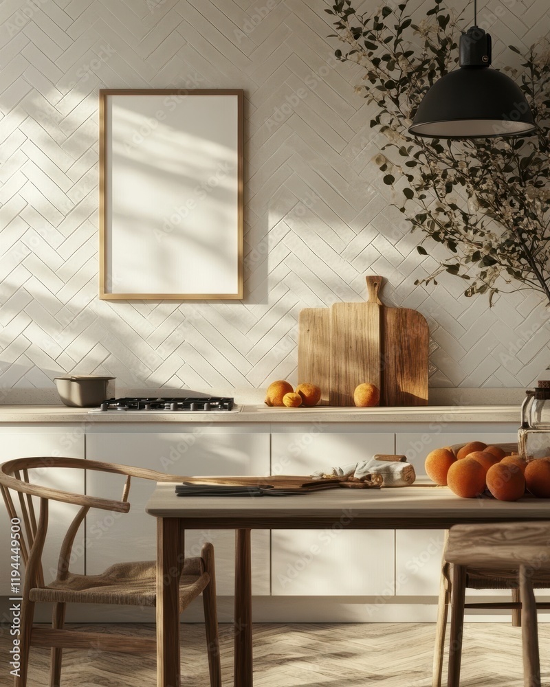 A Kitchen With A Table And Chairs, And A White Wall. There Are Two Empty Picture Frames On The Wall