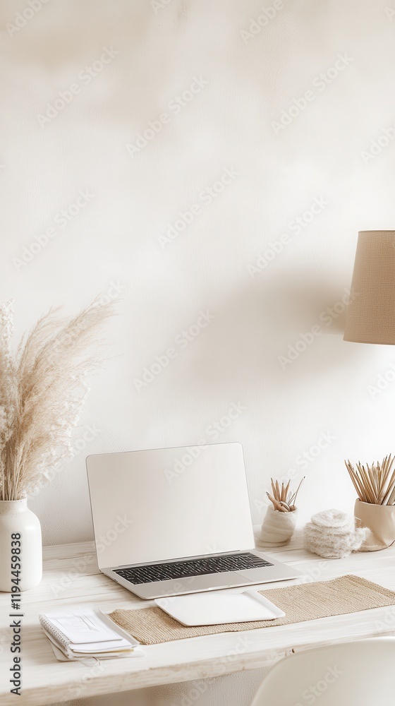 Minimalist White Desk Workspace With Laptop And Pampas Wallpaper Mural - Decorly Solutions | Decorly Solutions