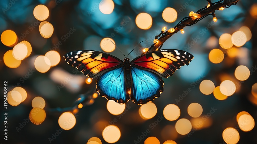 Blue butterfly on branch with bokeh lights Wallpaper