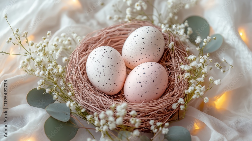 Nest with three pastel eggs surrounded by delicate flowers and soft textures in a serene setting
