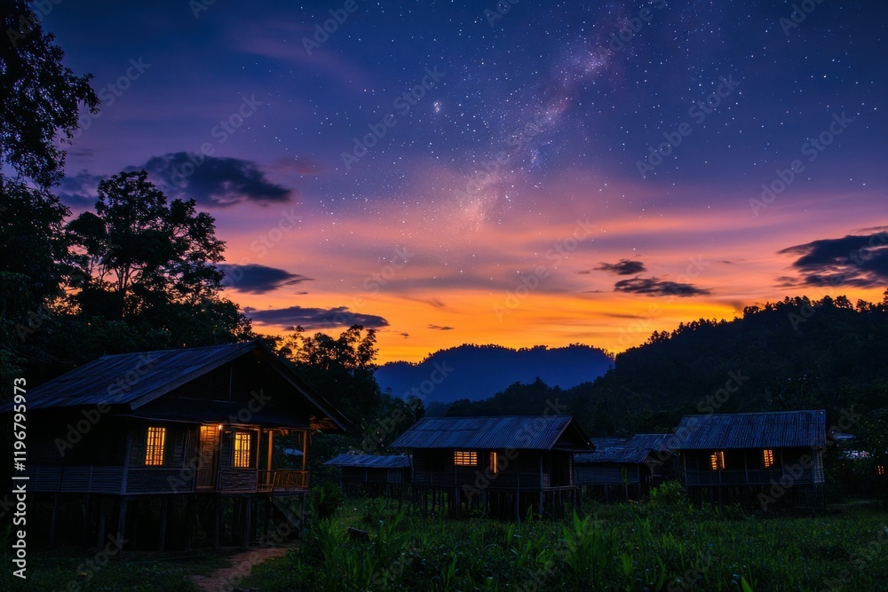 Serene Twilight Over Rural Village With Wooden Houses Wallpaper Mural - Decorly Solutions | Decorly Solutions