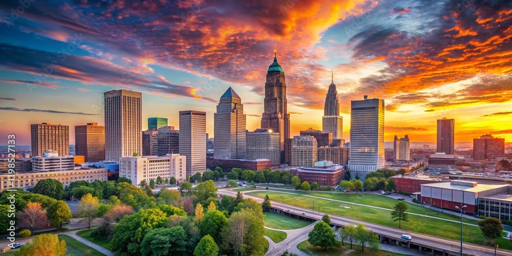 Cleveland Ohio Downtown Skyline Cityscape Panorama At Sunrise Wallpaper Mural - Decorly Solutions | Decorly Solutions