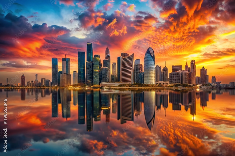 Panoramic View of a Vibrant Urban Landscape at Sunset with Striking Skyscrapers and Reflective Water Bodies, Ideal for Showcasing City Life and Modern Architecture
