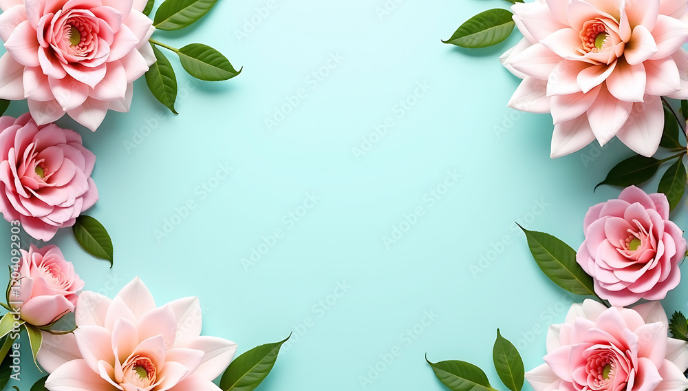 Floral heart frame with pink paper hearts on light blue background art