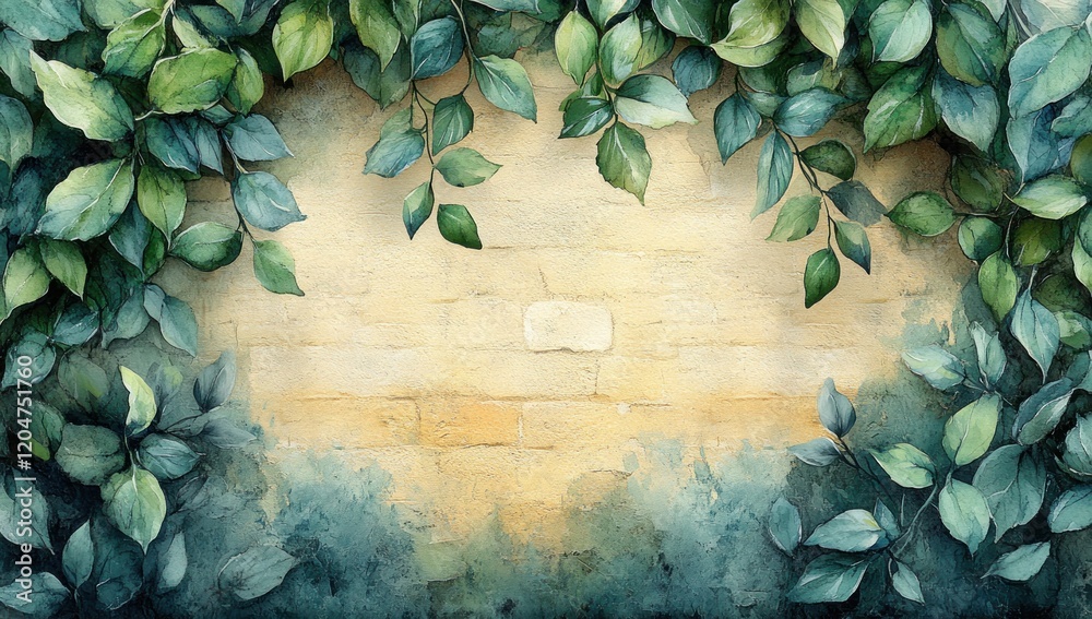 Natural Brick Wall Background With Fresh Green Watercolor Wallpaper Mural - Decorly Solutions | Decorly Solutions